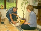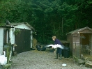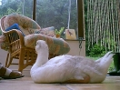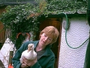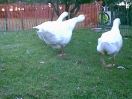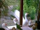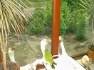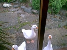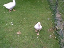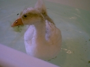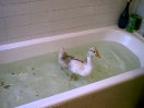 Still, after a week or two, he became used to the idea and began to live life to the full again, which included growing more feathers to replace his baby down. 'Twas then that it was noticed that there was a dark colouring on some of his new feathers. Now, within this gaggle it has been found that those geese who show dark colouring to their feathers are always female. So that started a major re-think about the sexing of Little Ray. From now on he will be known as female and his/her name changed to Rae!! So, Rae was suddenly seen to be sitting down a little more often than usual. It was a day we visited and we were there to witness the discomfort in her right leg/foot. A subsequent visit to the vet resulted in a lot of happy swims in the family bath because poor Rae had ripped the tendon in her foot. After a few weeks of restricting walking the foot seems to have healed, thankfully.